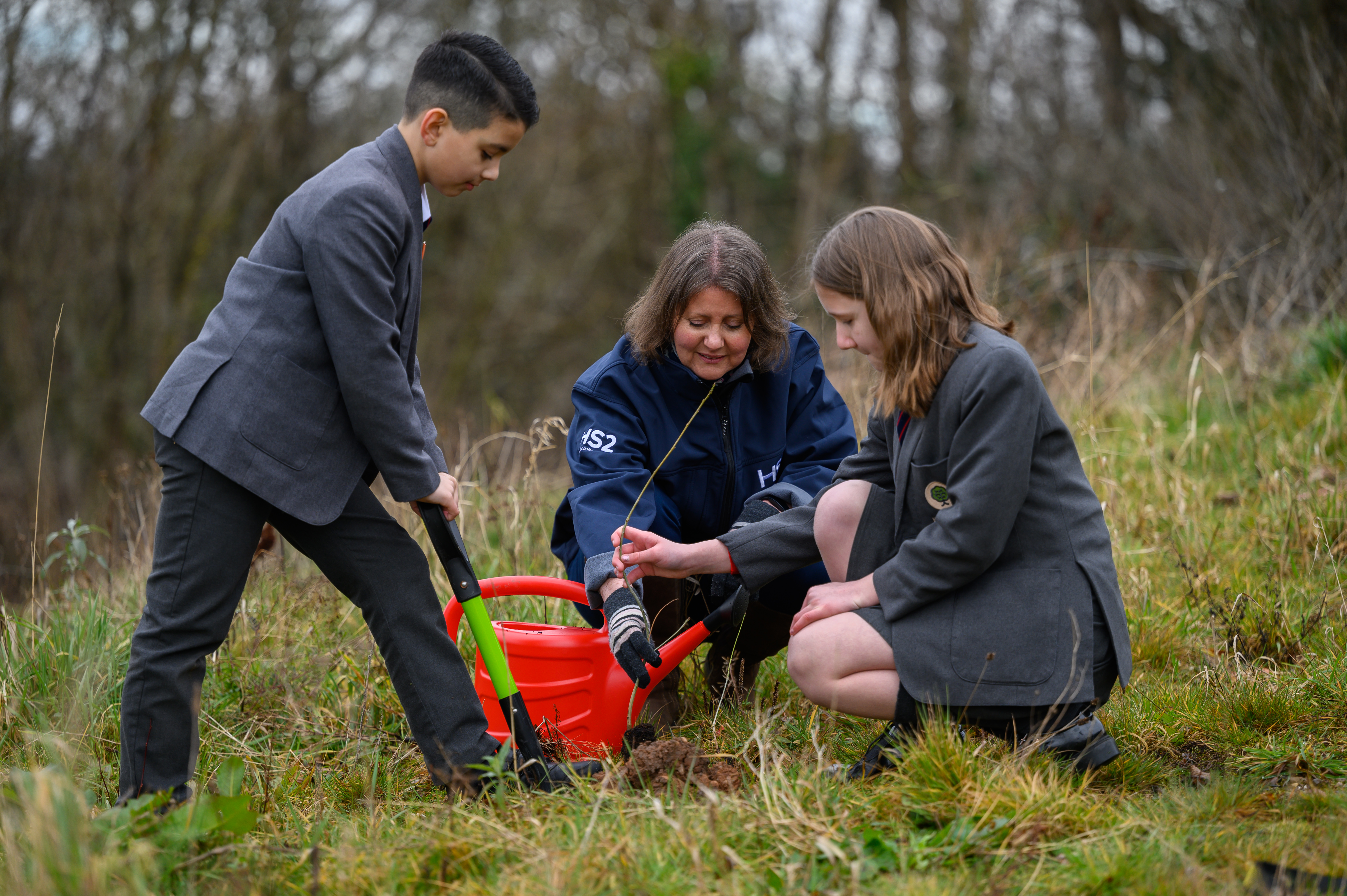 Pupils from High Meadow Community School planting an oak sapling with assistance from an HS2 representative, March 2022