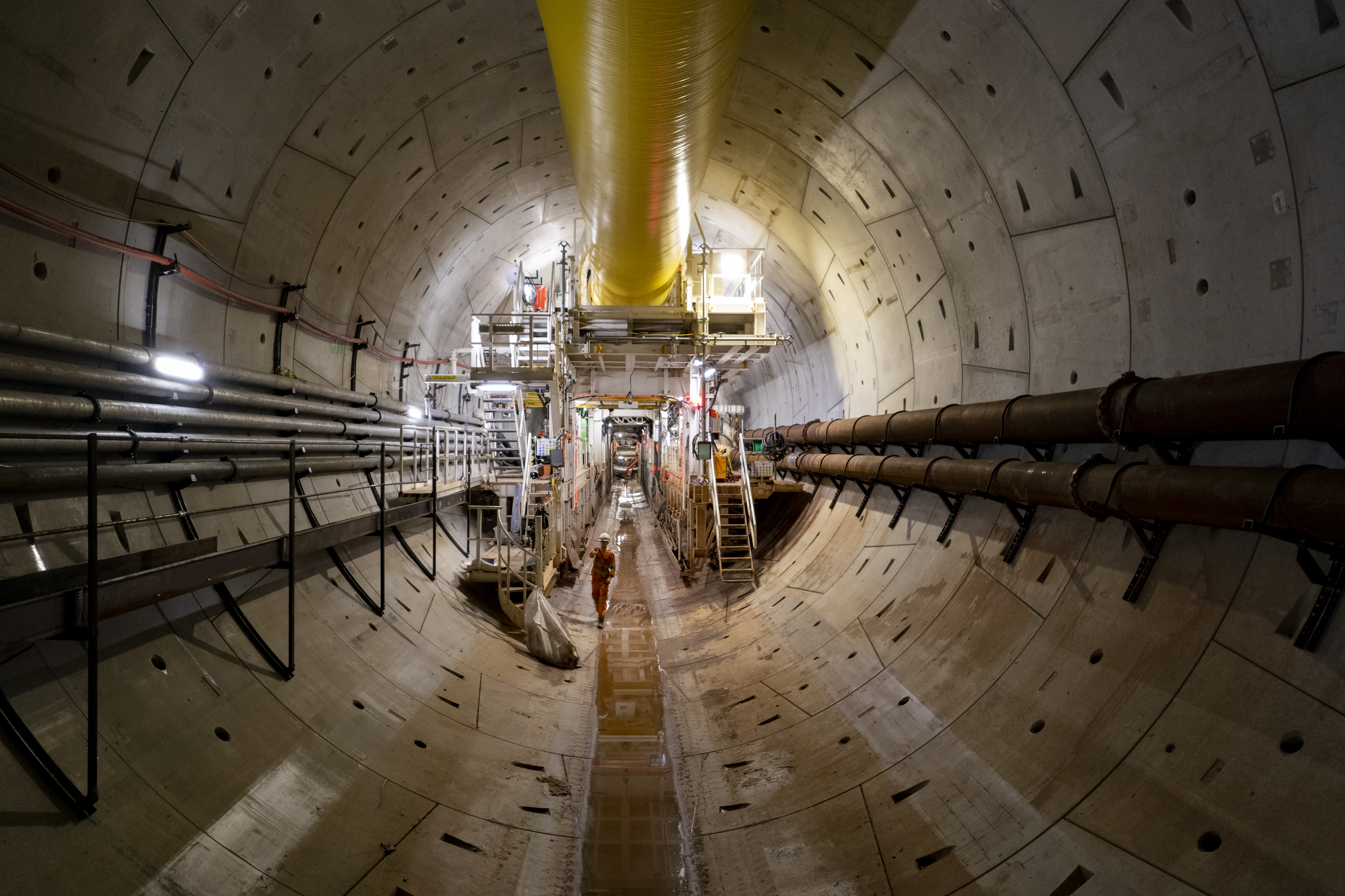 Construction worker in front of the TBM Anne cutterhead at Victoria Road