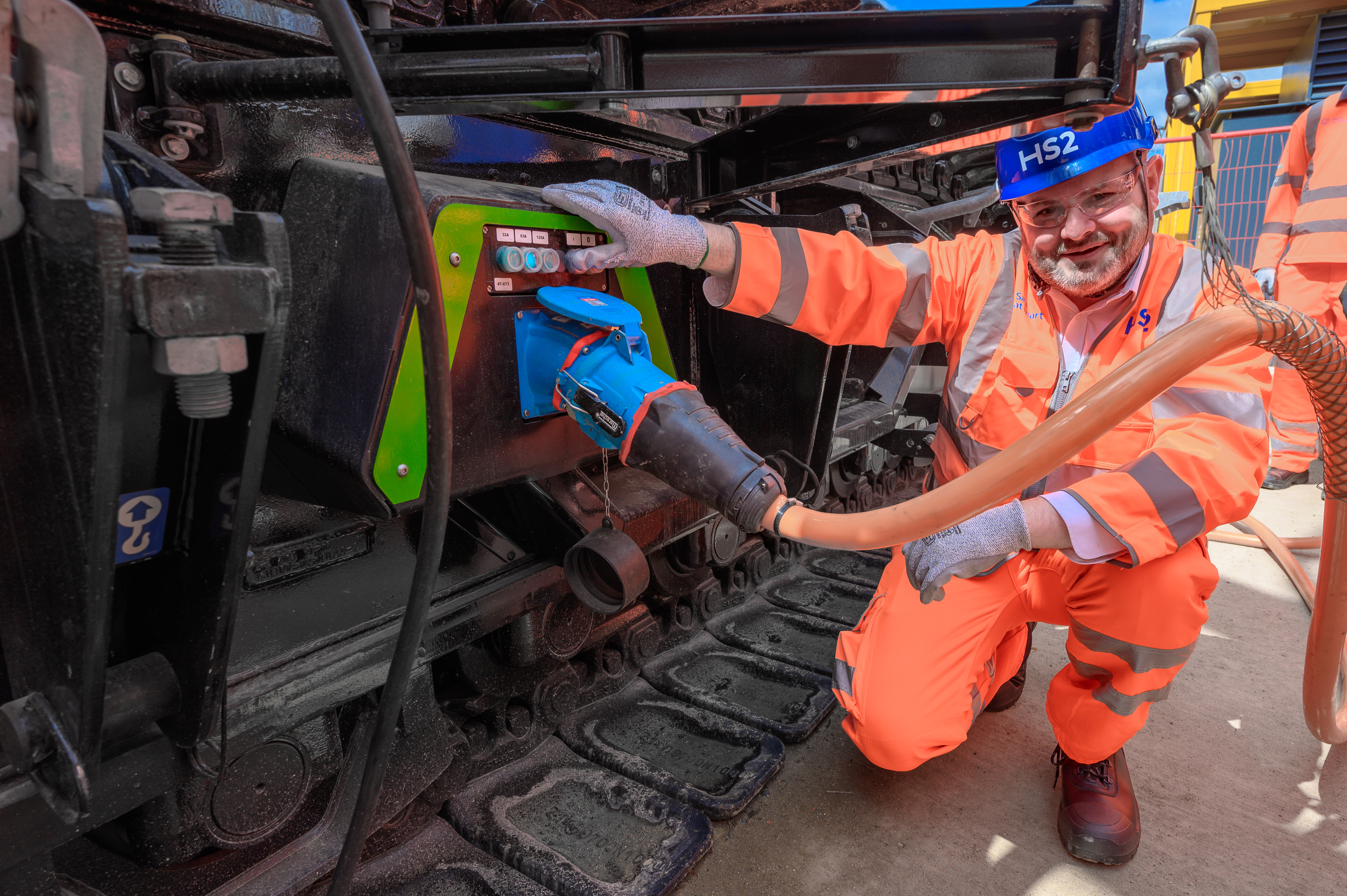HS2 Minister Andrew Stephenson with the emissions-free fully electric crawler crane on HS2's first diesel free construction site