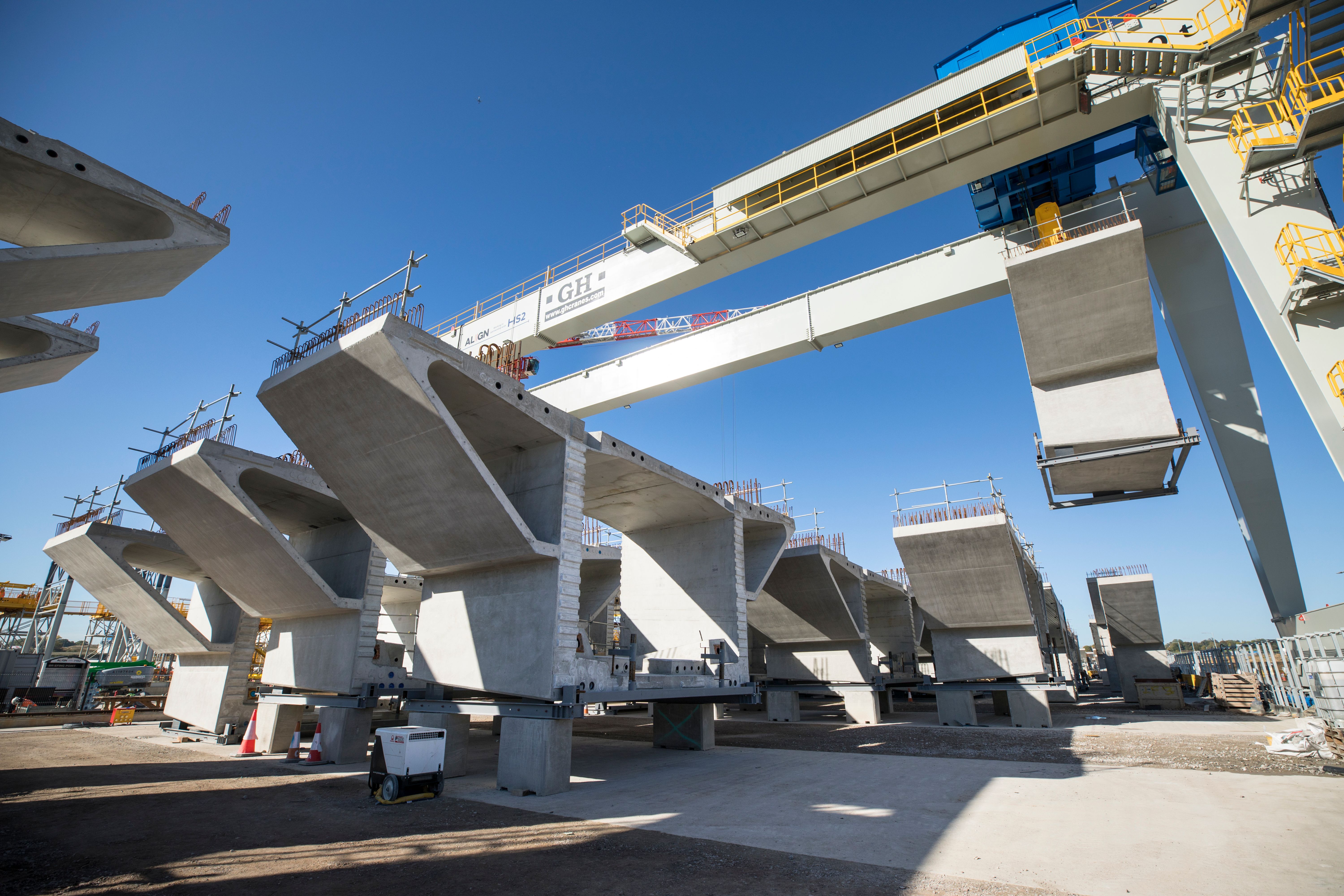 View of huge gantry crane moving huge viaduct deck segments into place, before they are transported to the viaduct site to be installed. The Colne Valley Viaduct will be made up of 1,000 individual segments.